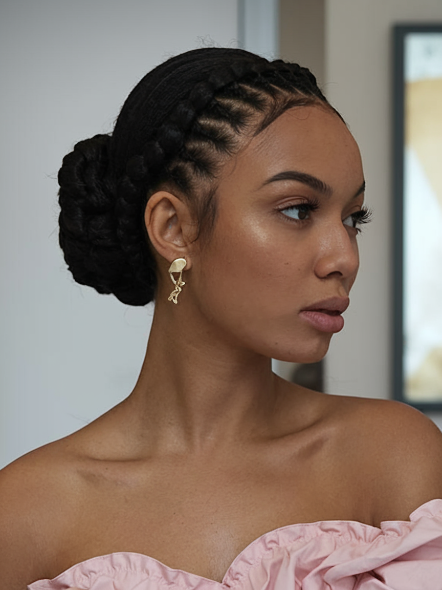 This natural cornrow braided bun is the epitome of elegance, perfect for formal winter occasions or even business settings. The intricate braiding pattern pulls the hair back into a low, protective bun, ideal for women who want to keep their hair neatly styled and tucked away during the colder months. Hydrate your scalp regularly to keep the protective style looking fresh.