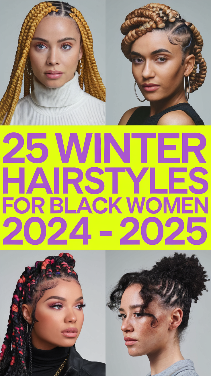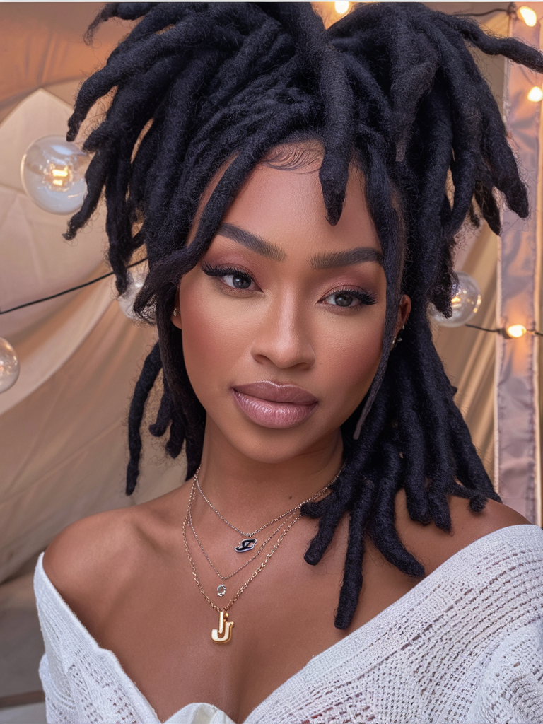 For those who love long locs, this stacked and voluminous loc hairstyle brings an artistic and edgy vibe. The locs are styled upwards, creating a striking silhouette that combines both volume and texture. Perfect for showcasing natural cornrow locs, this style can easily transition from casual day looks to more dramatic winter night outings.
