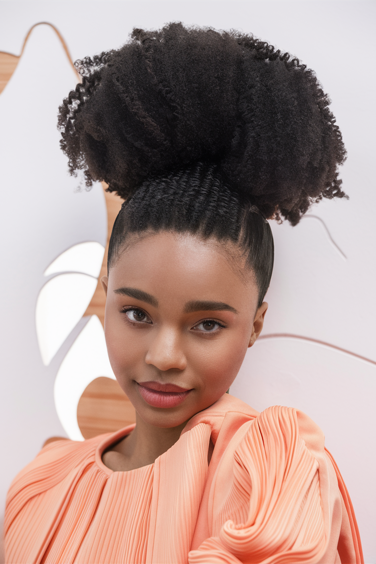This high puff combines a natural afro with beautifully defined twists at the base, giving the look structure and softness. The height of the puff draws attention to the face, while the twisted details add an element of elegance. It’s a great natural ponytail look for women who want a stylish yet protective style throughout winter.