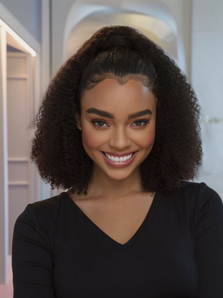 This curly half-up ponytail is a balance between fun and sophistication. The curls are beautifully defined, creating a voluminous, carefree look that’s perfect for women with natural textured hair. The weave ponytail offers extra length and bounce, making it a versatile style for both casual days and winter events.