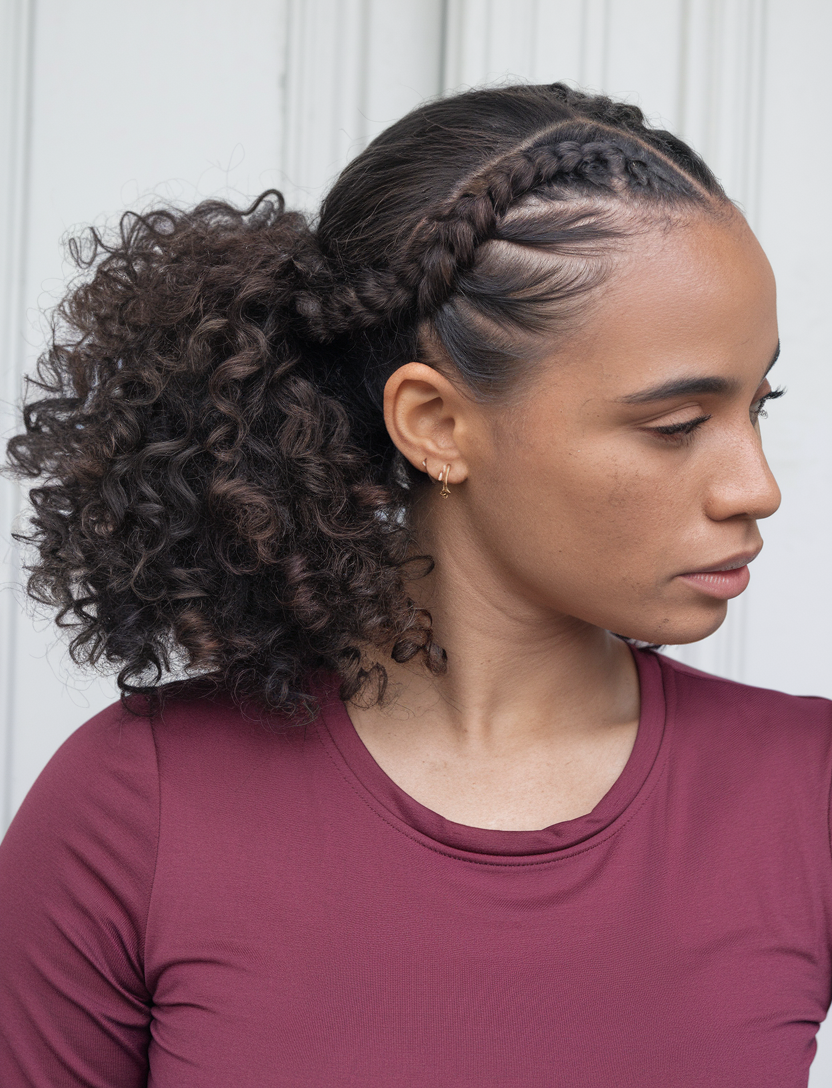 This natural ponytail incorporates tight cornrows leading into a fluffy, voluminous curly ponytail at the back. The combination of sleek braids and soft curls offers a balanced look that’s perfect for both business and casual winter settings. It’s a great way to blend structure with the free-flowing nature of curly hair.