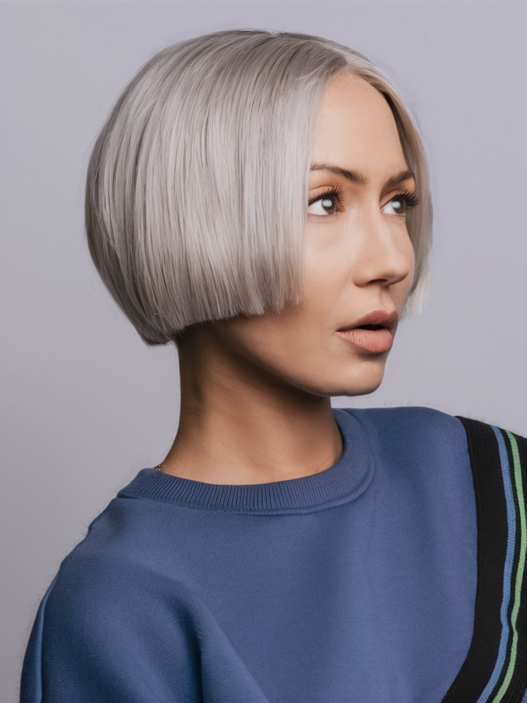 This sleek silver bob is a fantastic choice for women with fine flat hair. The precise cut gives a sharp, polished appearance, making it ideal for those who want to highlight their straight hair without much fuss. The soft layers at the ends add volume and texture, making it a go-to look for older women or those who want a sophisticated, trendy womens style.