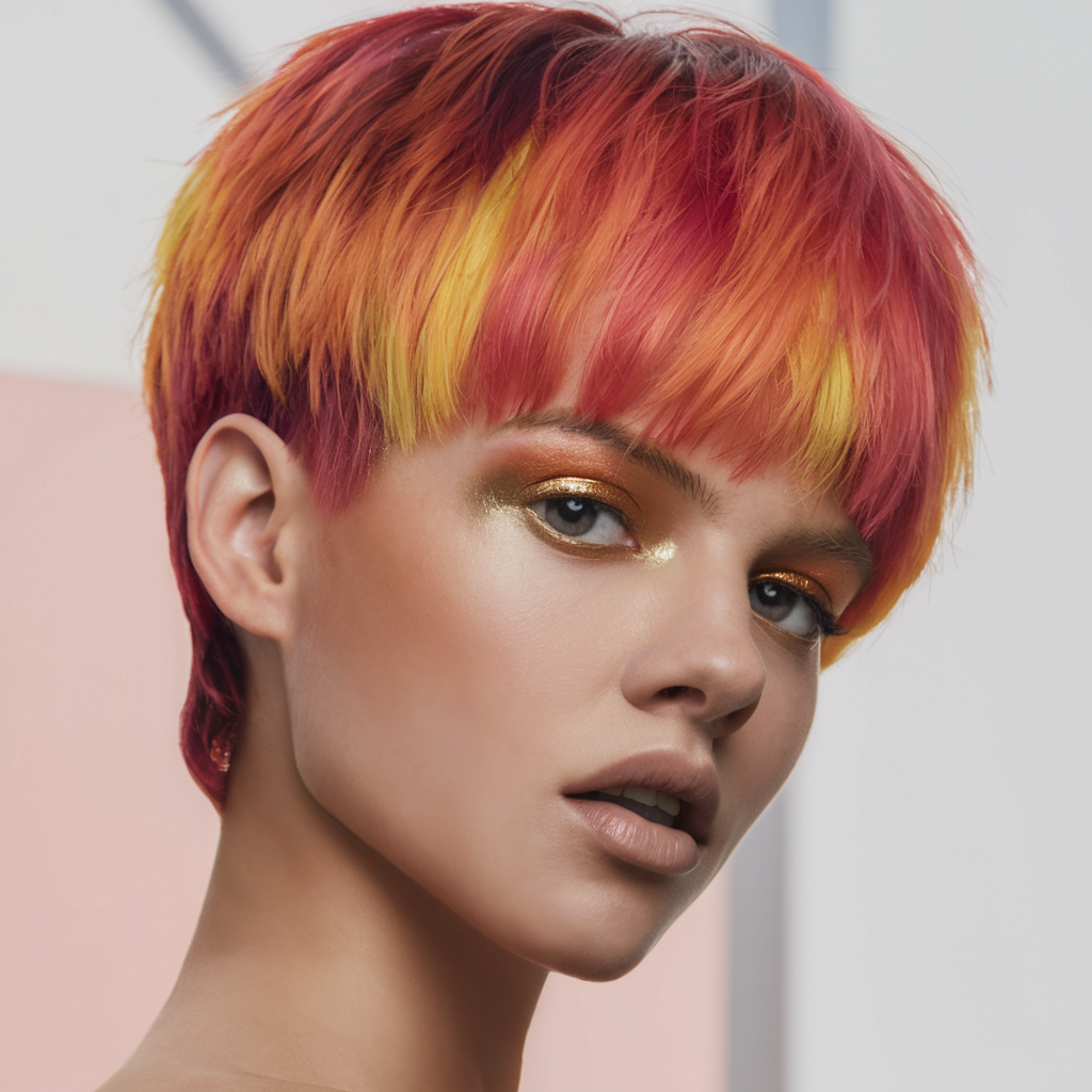 The fiery pixie cut is a daring yet playful look. With vivid shades of red, orange, and yellow, this cut adds warmth to the cold season, making it a standout in hair trends. Perfect for women with round faces, this style lifts the face while offering an energetic and super cute vibe. This is an especially popular look among Korean and wavy hair styles, blending bold color with a youthful edge.