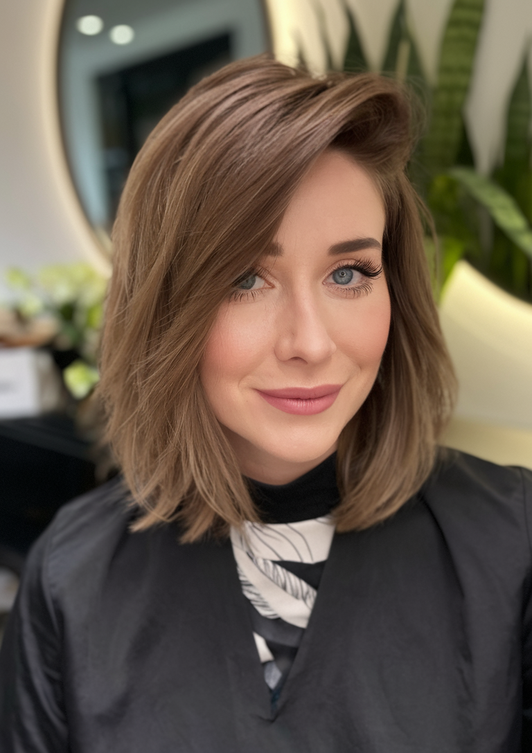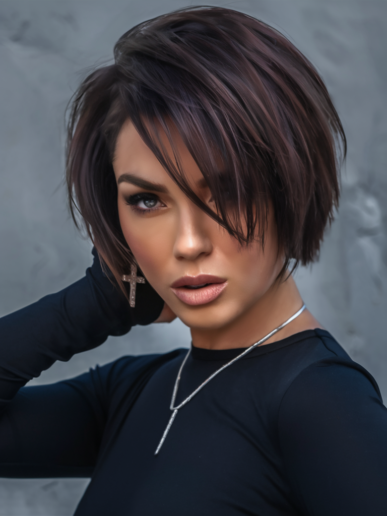 This textured bob gives a modern twist to the classic short cut. The wavy hair and layered texture add depth, making it a trendy option for women for round face shapes. The side-swept bangs add an element of softness, perfect for those who want to frame their face while keeping a little mystery. This look is highly versatile, working well with both casual and formal outfits, ideal for women fade hairstyles.