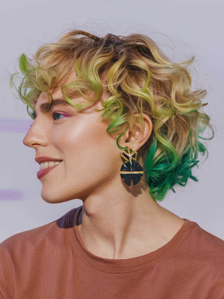 This bold hairstyle blends curly hair with a vibrant mix of blonde and green tones, making it one of the standout trendy womens haircuts for 2024. The playful contrast of the colors highlights the bouncy curls, creating a fun and lively look. It’s perfect for younger women looking to experiment with color and show off their energetic side. The cut, with shorter layers, is easy to manage, making it great for those who want a low-maintenance yet eye-catching style.