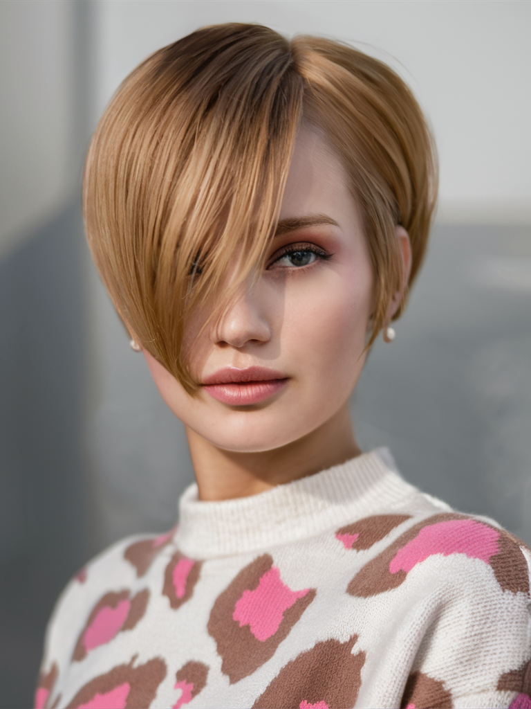 This asymmetrical bob features a unique, edgy cut, with longer pieces in the front and shorter at the back. Perfect for those who want to stand out, this look gives a fresh, dynamic twist to the classic bob. The warm blonde tone adds softness to the bold shape, making it a hit for 2024 hair trends.