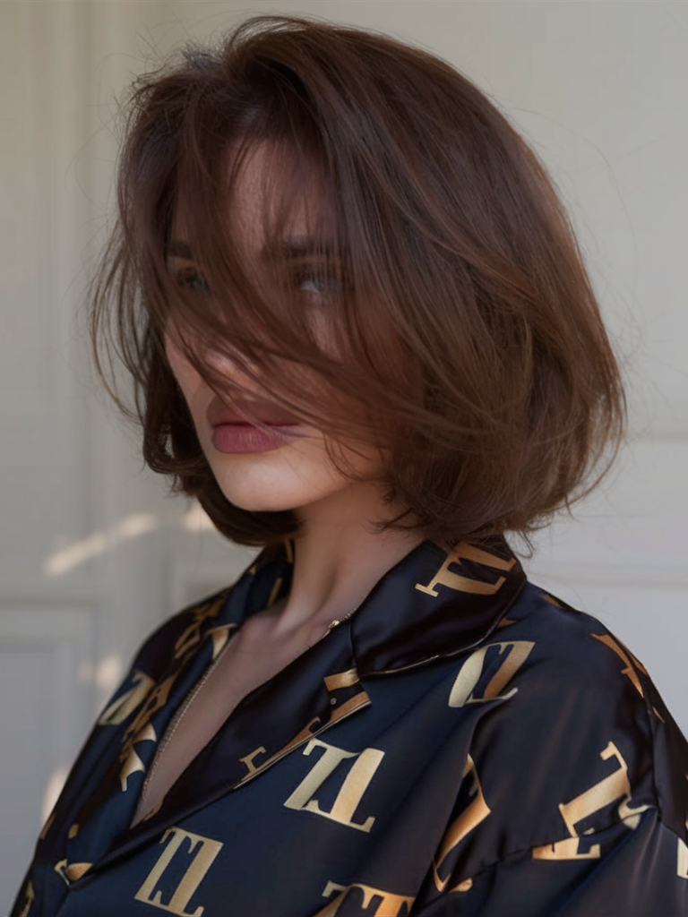 This medium-length bob with soft layers creates a beautiful, voluminous look. The natural brunette shade paired with the layered texture gives it a soft, feminine edge. This cut works well for those with thin hair, adding body and dimension, making it a trendy choice for the season.