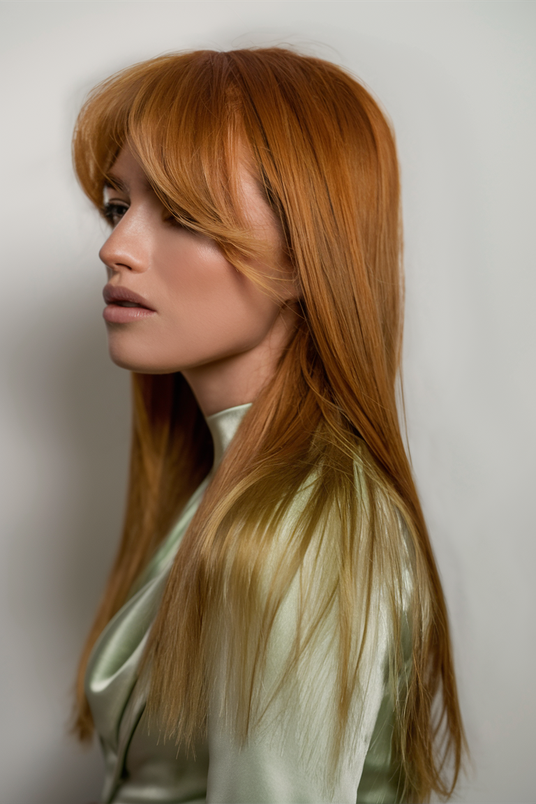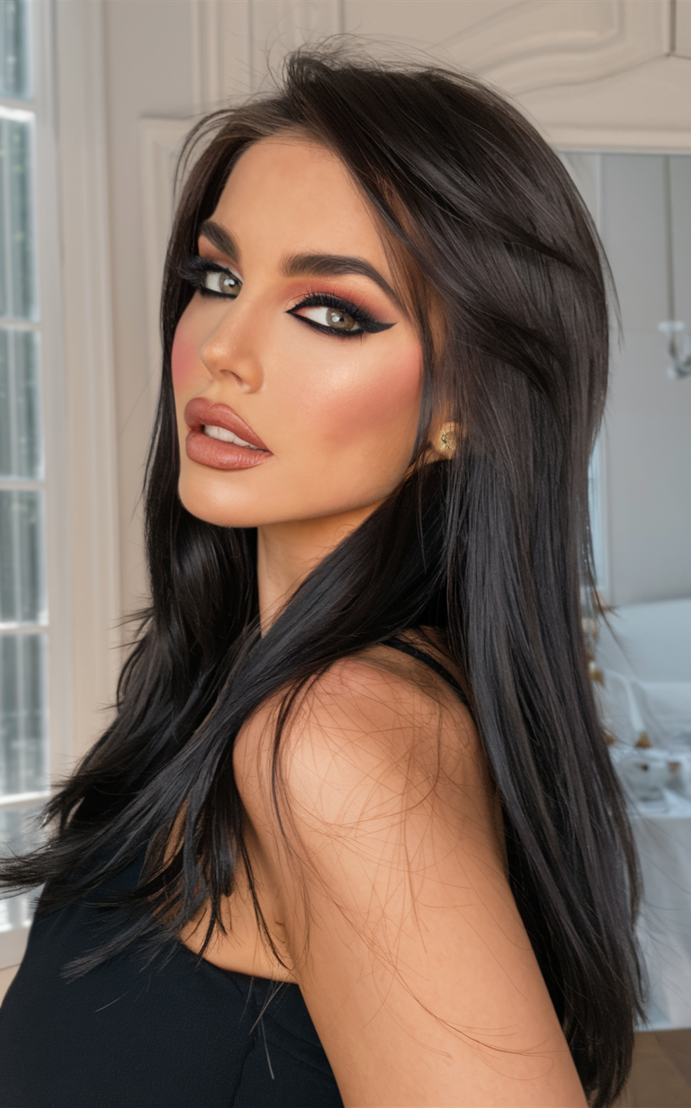 This long, sleek style is all about polished sophistication. The long layers give the hair a smooth finish while adding movement without losing its sleek appearance. The glossy black tone is striking and perfect for a trendy look this winter, ideal for women looking to keep their style refined yet impactful.
