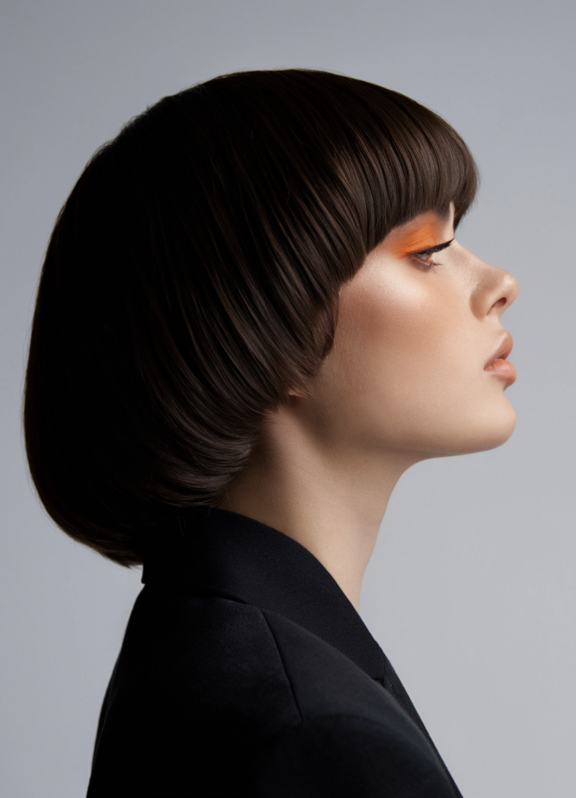This short hairstyle is a modern take on the classic bowl cut, featuring sharp lines and smooth texture. Ideal for those with thick hair, this look offers a minimalist yet bold vibe, making it perfect for autumn 2024 hair trends. The glossy dark shade enhances the sculpted form, creating an effortlessly stylish silhouette.