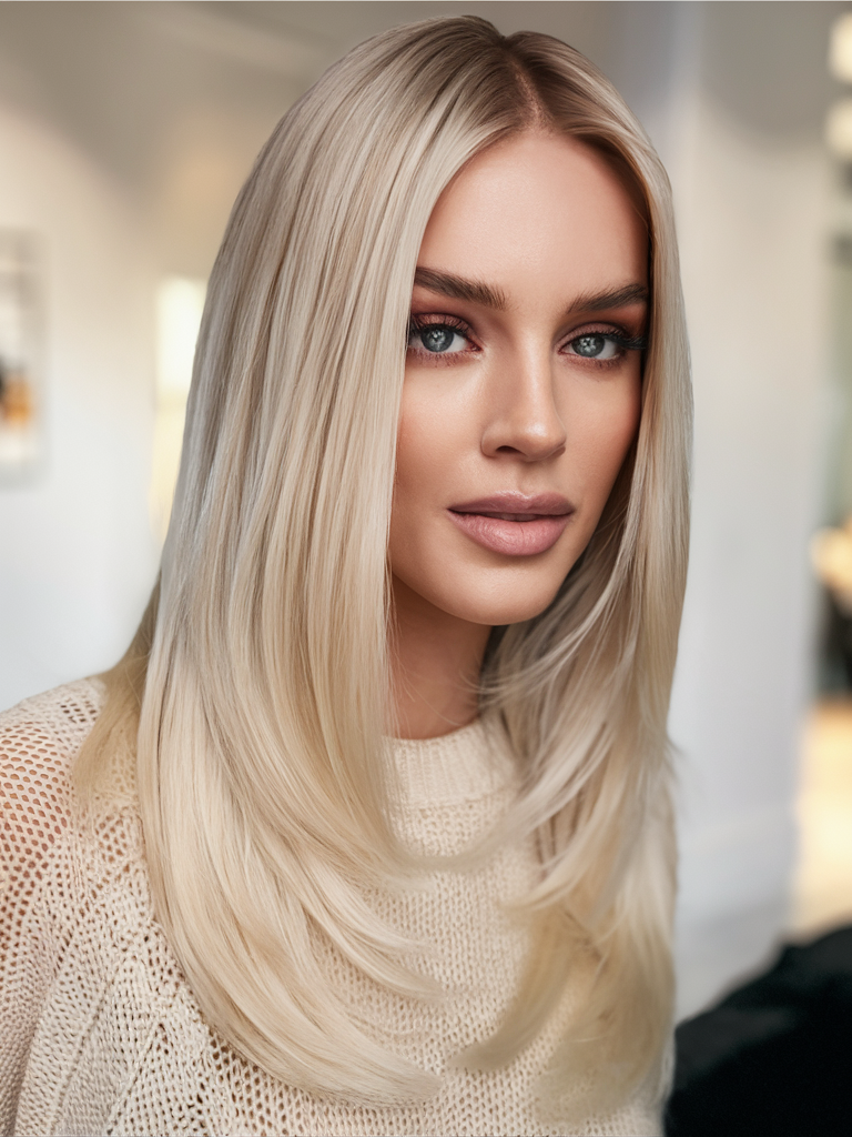 This sleek platinum layered cut is a polished and modern style for 2024 hair trends. The subtle layers around the face add softness and dimension while maintaining a smooth and shiny finish. Perfect for anyone wanting a chic, low-maintenance look that feels timeless yet trendy.