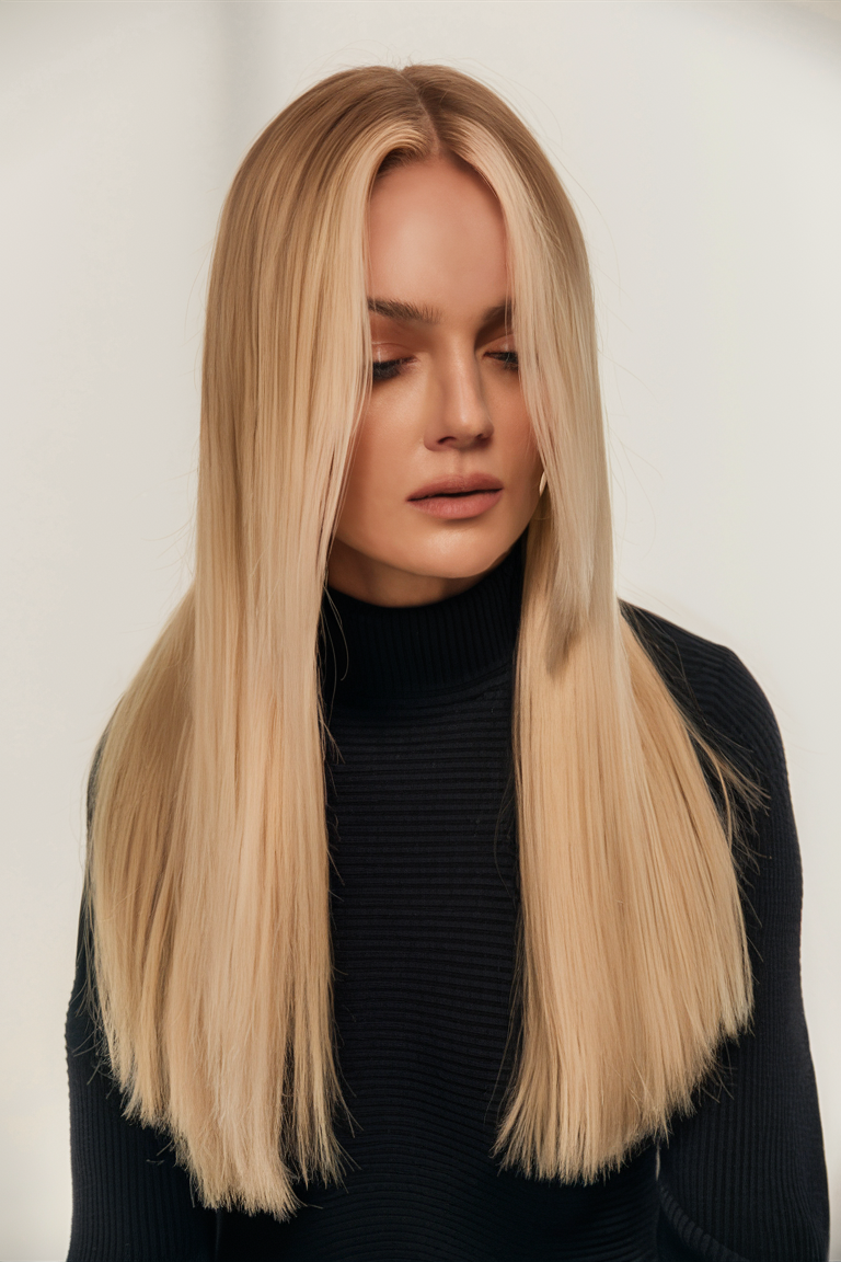 The center-parted long blonde hair showcases a sleek, straight look that’s effortlessly elegant. The length gives versatility, allowing for both casual and formal styling. This trendy cut is perfect for women looking for a simple yet impactful hairstyle for 2024.
