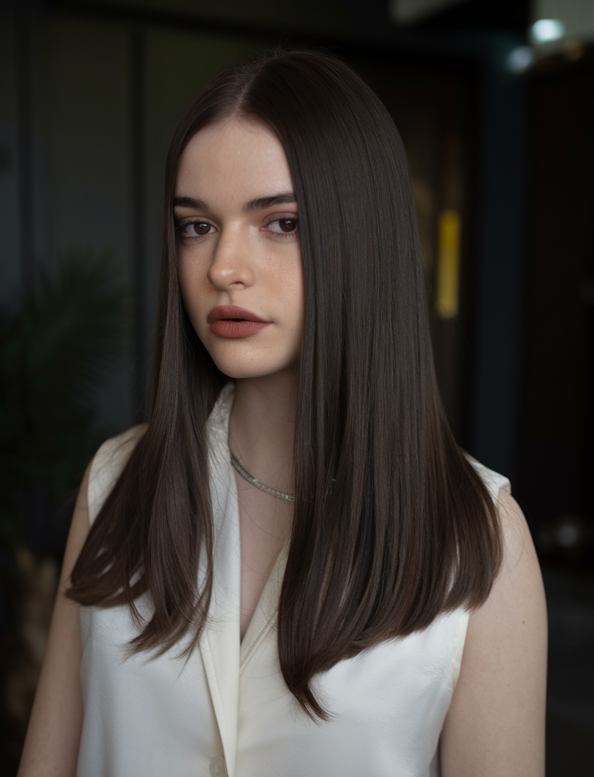 This long, sleek hairstyle is all about straight lines and smooth textures. Ideal for those with fine hair, it offers a polished, professional look. The clean middle part enhances the simplicity of the style, making it one of the most sought-after long hair trends for 2024.