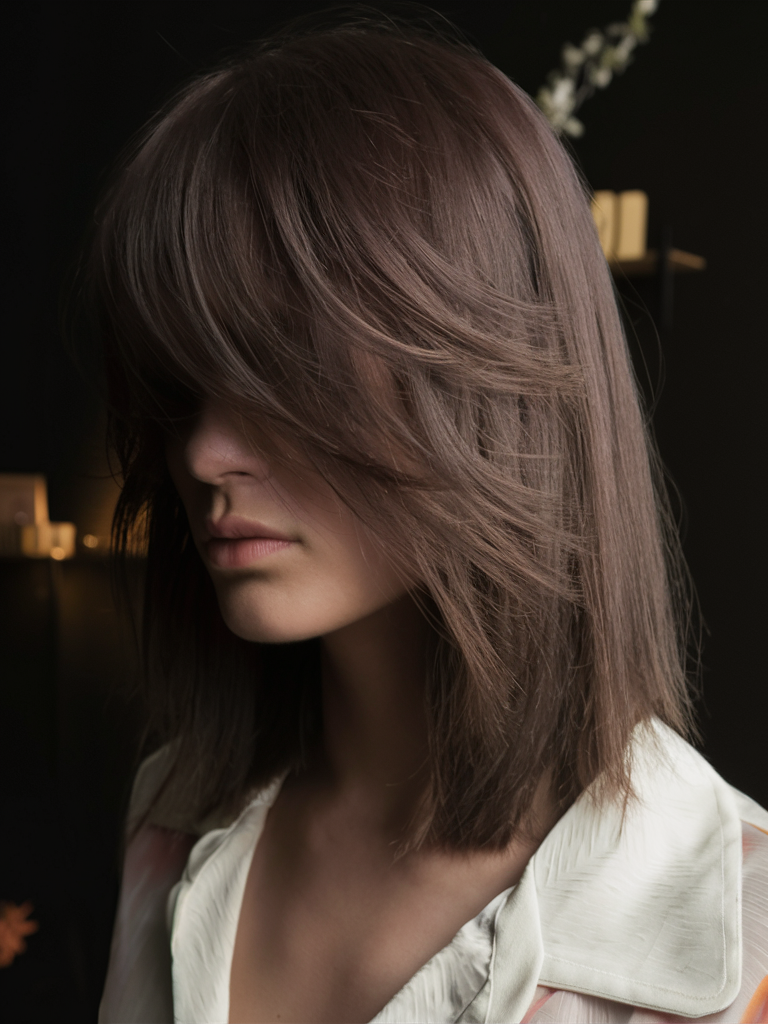 This medium-length bob with curtain bangs adds softness and movement to the look. The layers give the hair texture and volume, making it a perfect choice for fine hair. The curtain bangs frame the face beautifully, giving the cut a trendy and effortless vibe for 2024.