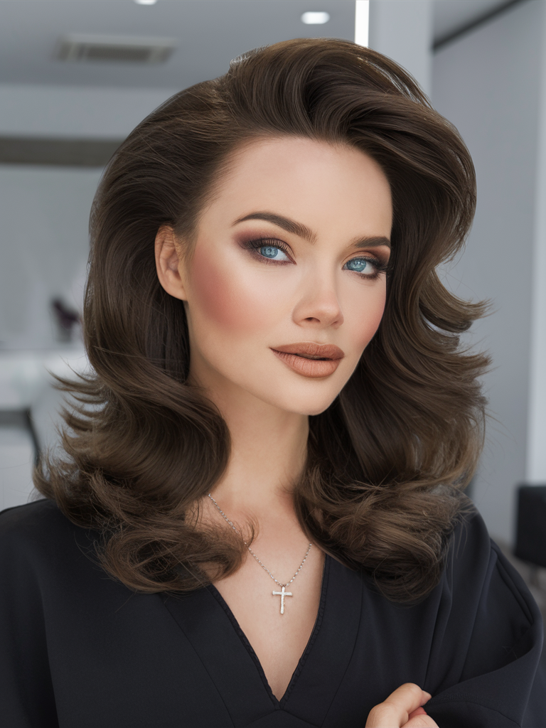 This bold and voluminous wavy hairstyle offers a glamorous, polished appearance with large, structured waves. The height at the crown enhances the overall volume, making it an excellent choice for special occasions. Ideal for long hair, this style keeps your look fresh and chic, standing out as one of the best trends for 2024.