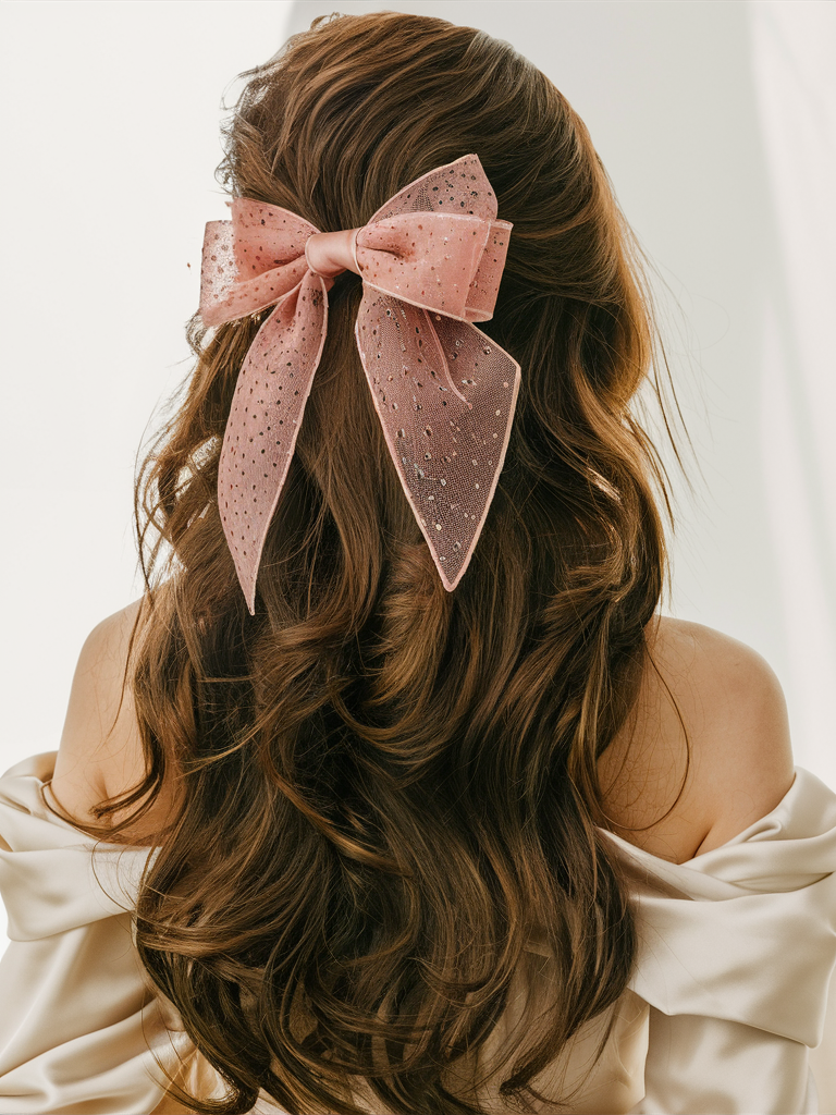 This romantic long hairstyle features soft, natural waves tied with a delicate bow at the back, adding a feminine touch. The cascading waves add volume and movement, perfect for creating an effortlessly elegant look. This long hair style with an accessory is a go-to 2024 inspo for formal events or everyday glam.