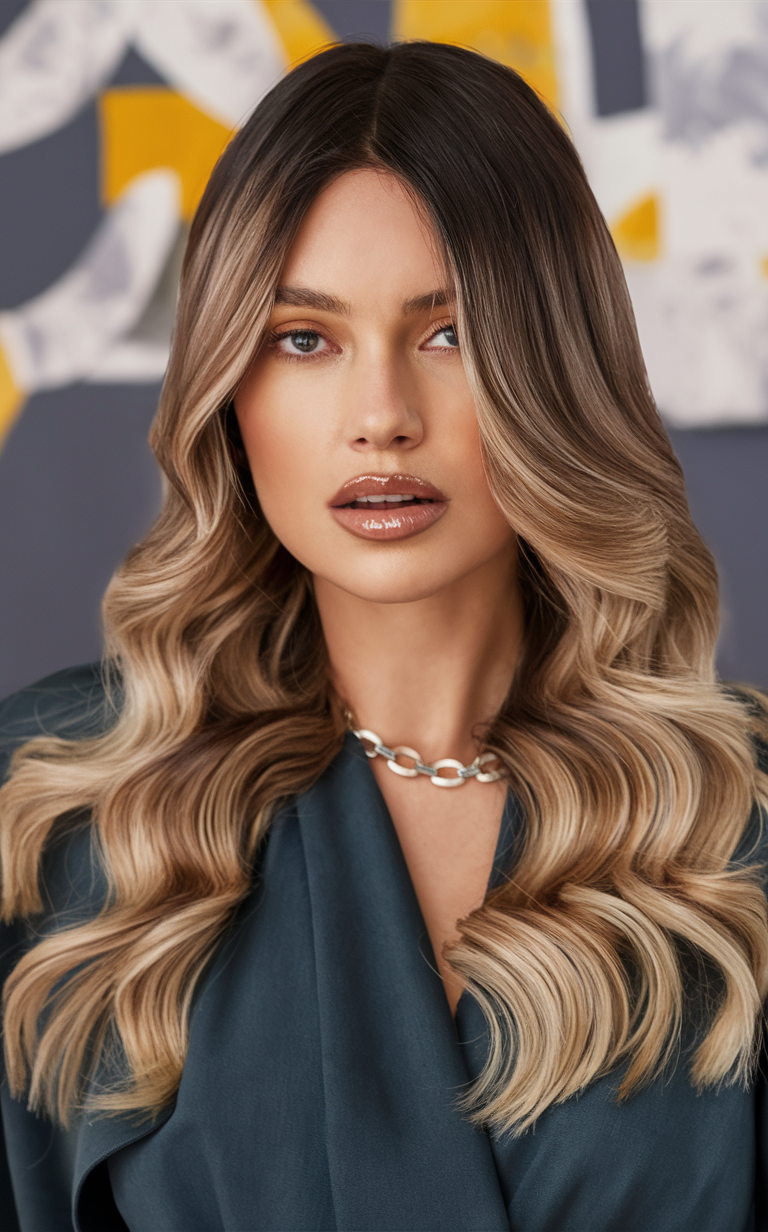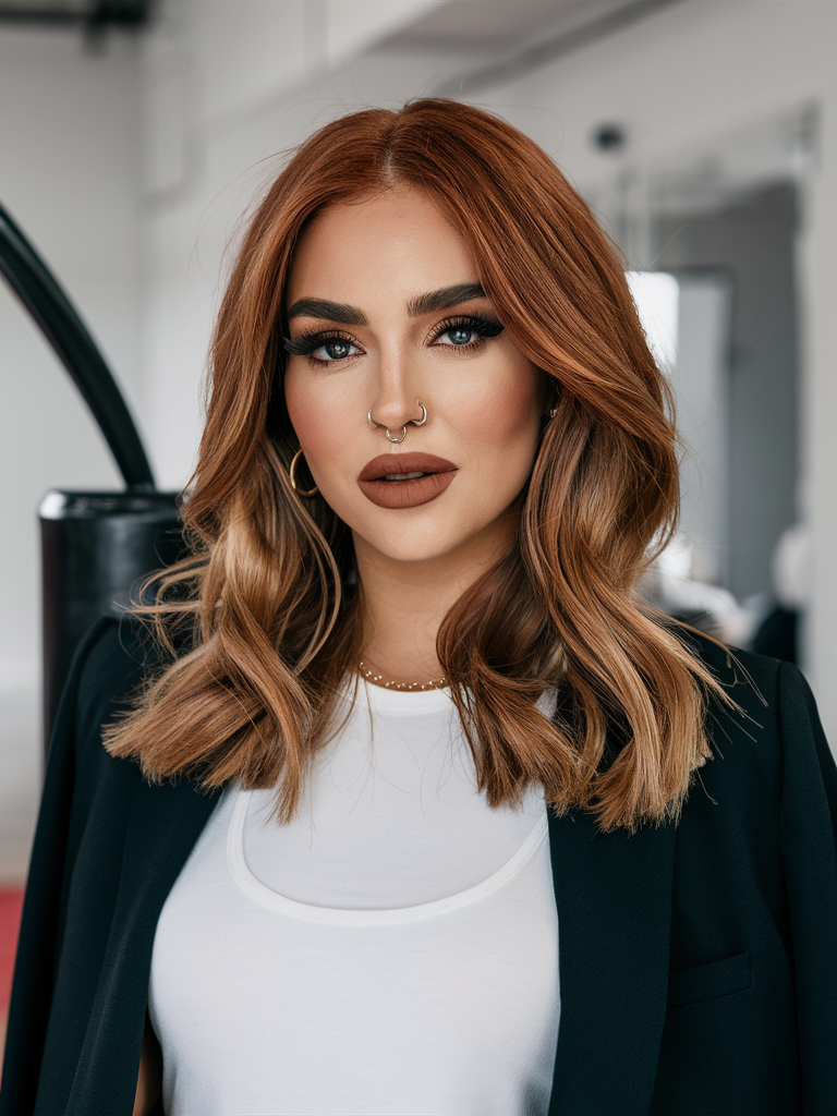 This fall hair highlights 2024 style brings a beautiful balance between brunette and blonde, featuring darker roots transitioning into warm golden and honey tones at the ends. Perfect for brunettes looking to soften their look with natural highlights, this style adds depth and dimension while keeping a natural, sun-kissed glow. It’s ideal for women with warm skin tones and can be maintained using color-protecting products like Redken Color Extend. The lowlights blend seamlessly with the lighter highlights, making it a versatile and trendy option for autumn.
