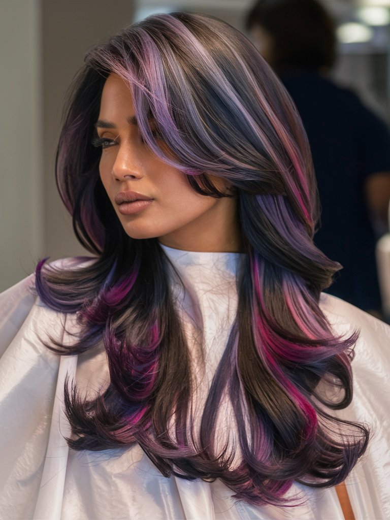 For a daring and trendy autumn look, these lowlights in shades of purple and magenta add depth and boldness to darker base colors, especially for brunettes. The combination of soft layers and striking lowlights is perfect for those wanting to make a statement with their fall hair. This look works best on brunettes or those with darker hair looking to experiment with vivid colors. Maintenance includes using sulfate-free shampoos like Pureology Hydrate, ensuring the vibrancy of the lowlights lasts through the season.