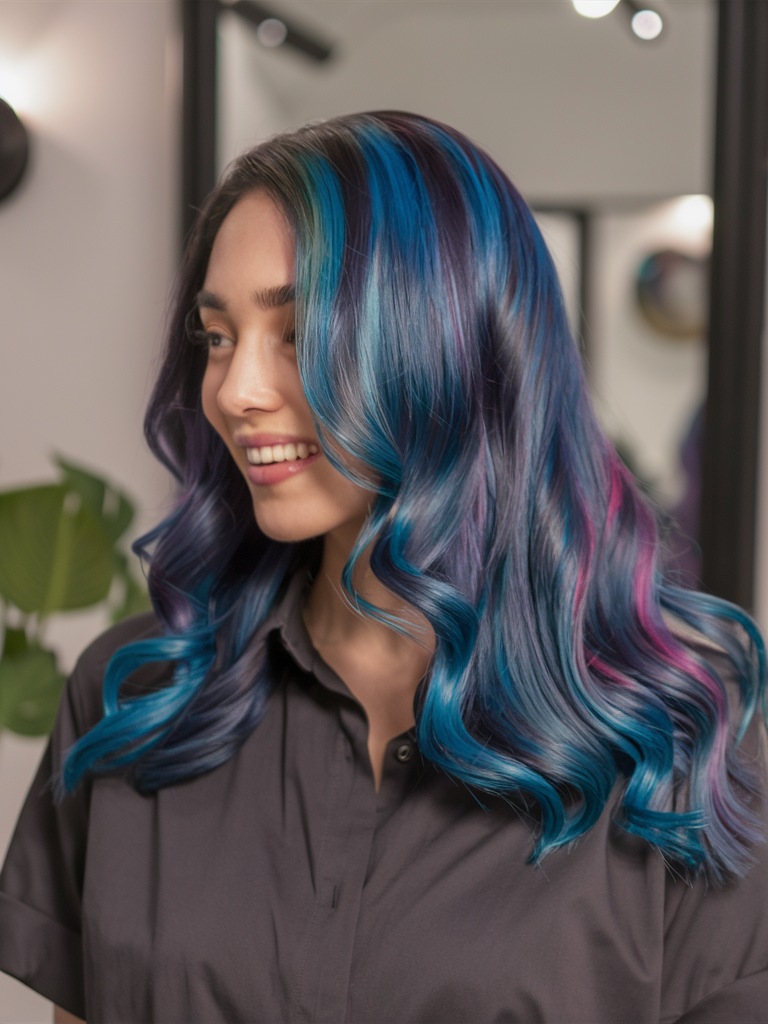 For those craving a bold change, this fall hair highlights 2024 look is all about vibrant blues and purples, offering a unique twist on traditional highlights. The lowlights create a stunning contrast with the dark base, adding dimension and a vivid pop of color that is sure to turn heads. Perfect for brunettes who want to add some edge to their style, this color combination works beautifully with layered, wavy hair, adding movement and volume. Regular use of color-protecting shampoos like Pureology Hydrate will help maintain the vibrancy of these shades throughout the season.