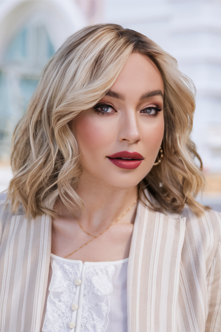 This chic blonde bob with layered waves is a perfect match for fall hair highlights 2024. The layers add movement and texture, while the soft blonde tones create a fresh and youthful appearance. Ideal for women who want a short, low-maintenance style for autumn, this look can be easily maintained with Kevin Murphy Blonde Angel Wash to enhance the shine and softness of the blonde.