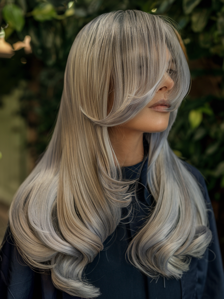 This fall 2024 trend showcases sleek, platinum silver hair with soft, rounded layers that add dimension and movement. The cool-toned silver highlights create a futuristic and bold look, perfect for those wanting to stand out this season. To keep the silver tones vibrant and prevent yellowing, use Fanola No Yellow Shampoo, ensuring the platinum stays icy and fresh throughout autumn.