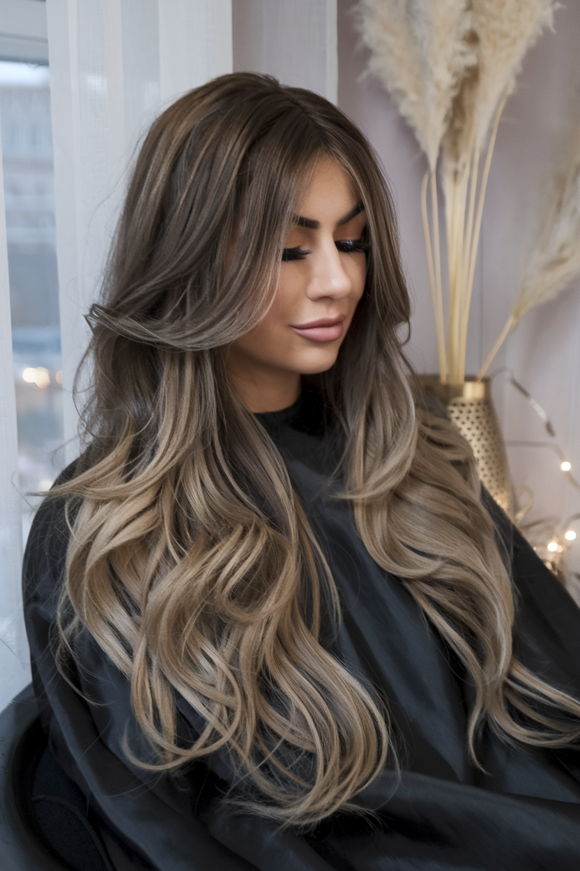 This lowlights blonde balayage brunette style is all about dimension and contrast. Dark roots flow into ashy blonde highlights, giving depth and movement to the hair. Ideal for brunettes who want to brighten their look without fully committing to a blonde transformation, this style suits a variety of skin tones. Keep the color vibrant with Olaplex No. 4P Blonde Enhancer Toning Shampoo to prevent brassiness and maintain the cool tones.
