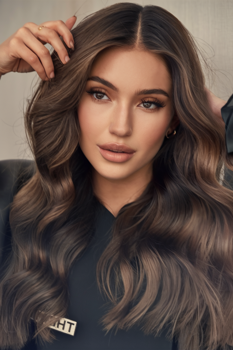 These rich brunettes 2024 waves feature warm, caramel highlights that add depth and a sun-kissed effect. Perfect for fall, this hairstyle brings a natural glow to brunettes who want to add subtle brightness. The soft waves create volume and texture, making it an ideal style for medium to long hair lengths. Maintain the warmth of the highlights with Aveda Color Conserve Daily Color Protect to keep the color from fading.