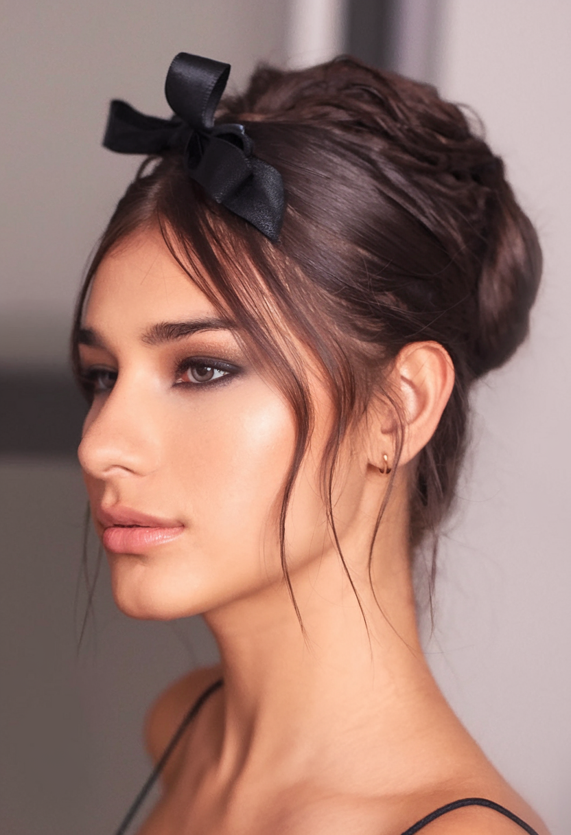 This brunette updo, accented with a black bow, brings sophistication to fall 2024. The soft bangs and intricate styling flatter round faces, making it a go-to choice for special occasions, especially for women with fine or medium hair.