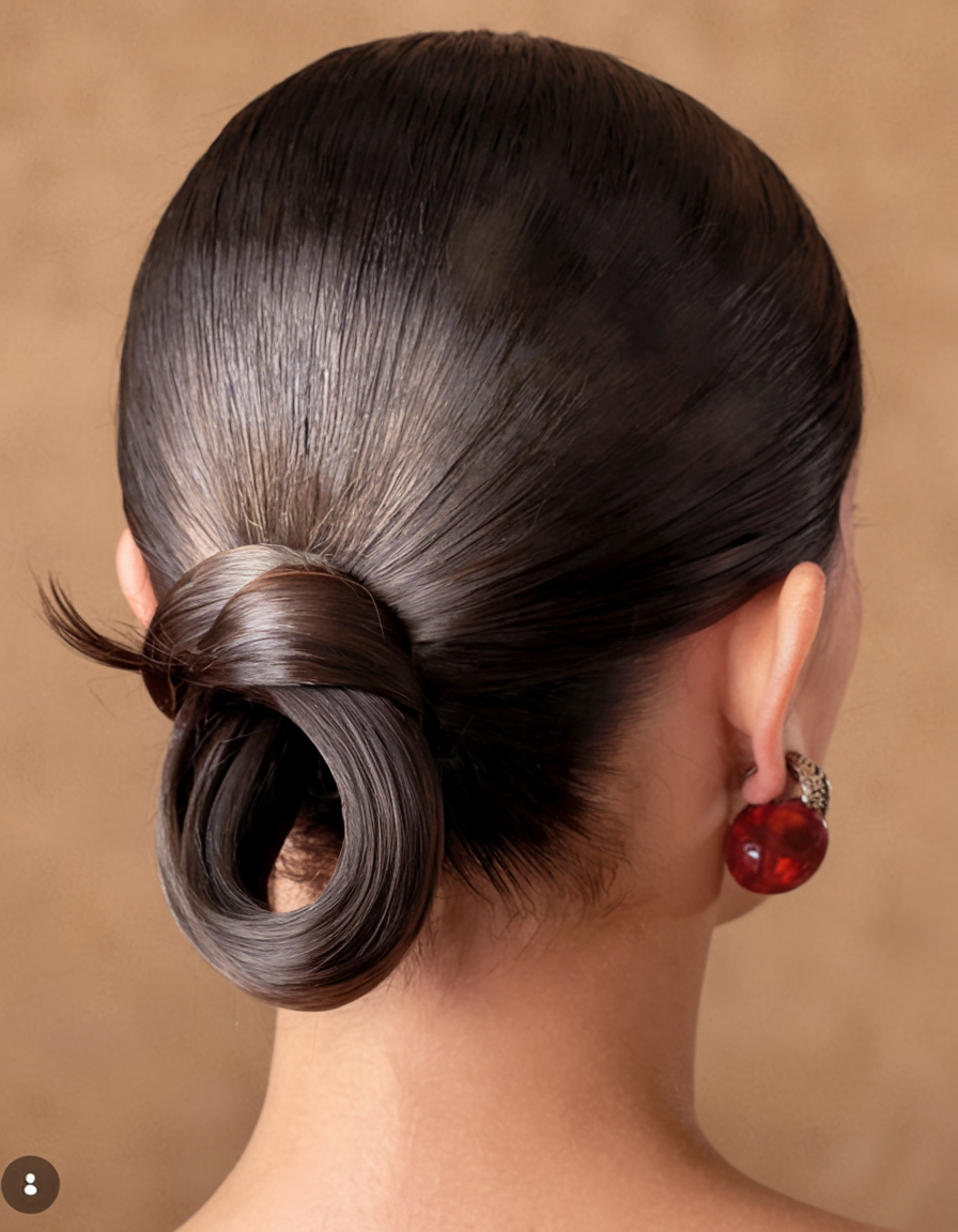 A sleek low loop bun is an elegant and timeless fall 2024 style for women with fine, dark brown hair. This hairstyle is great for formal occasions, offering a polished and smooth finish. It’s ideal for women seeking a minimalist yet sophisticated look that flatters round faces and works with both medium and long hair.