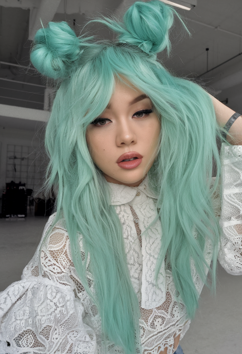 For a fun and trendy fall hairstyle for long hair 2024, this mint green style with loose space buns is a bold, youthful choice. It’s both cute and whimsical, perfect for events like prom, party, or a casual red carpet look. The loose, wavy locks add texture and volume to the style, while the space buns offer a playful edge. This is a great look for someone seeking a trendy but easy style to turn heads at both casual outings and more formal settings.
