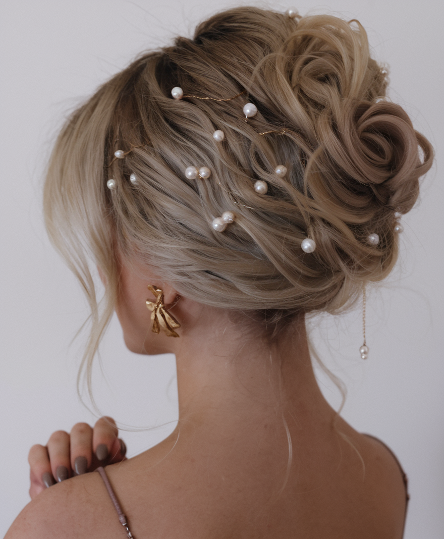 This stunning fall hairstyle is the epitome of bridal elegance, featuring an intricate updo adorned with delicate pearls. Ideal for weddings, whether you’re the bride, a bridesmaid, or a wedding guest, this look brings a timeless charm to any formal occasion. The soft, romantic curls and pearls make it a simple yet sophisticated style, perfect for evening events, prom, or red carpet appearances. It’s an easy choice for those looking for a classic updo with a modern touch.