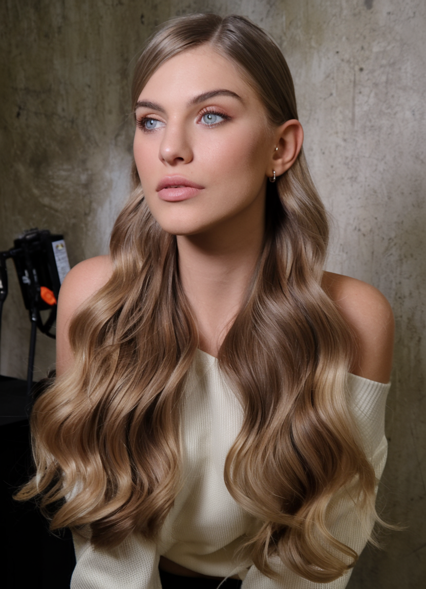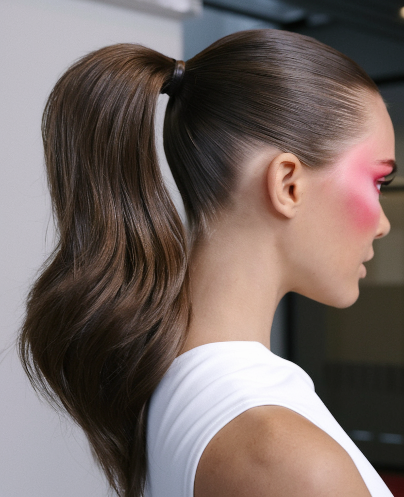 This sleek high ponytail is a perfect choice for fall hairstyles for long hair 2024, offering a polished yet easy style suitable for any occasion, from a formal red carpet event to a day at work. The smooth, glossy finish paired with loose, voluminous waves makes this look both elegant and effortless. This ponytail is ideal for brunettes seeking a sophisticated, simple style that works well for evening events or wedding parties, including as a bridesmaid or wedding guest. The timeless appeal of the ponytail with its modern twist keeps it both trendy and versatile.