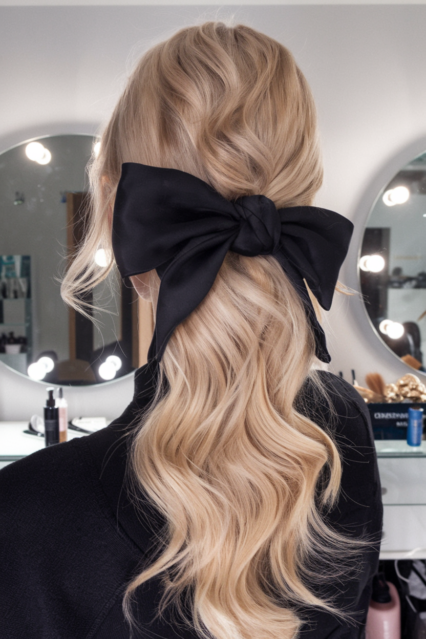 This half-up, half-down look with soft waves and a large satin bow is an ideal hairstyle for a bride or wedding guest. The soft, flowing waves create a classic romantic look for fall hairstyles for long hair 2024, while the black bow adds a modern, chic touch. Perfect for formal events like prom, weddings, or an evening party, this style is both simple and elegant. It’s an easy way to elevate a bridesmaid or bridal look while staying on trend for the season.