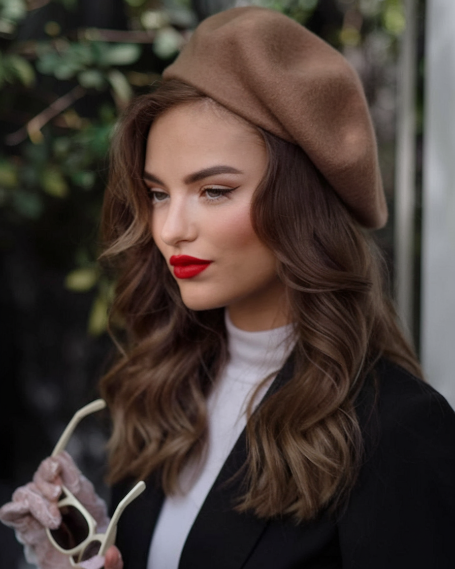 This elegant wavy hairstyle paired with a chic beret is the epitome of Parisian fall fashion. Perfect for brunettes looking for a cute and casual style for autumn, these soft waves are both effortless and timeless. This look works for everything from work to wedding guest appearances and is a standout for fall hairstyles for long hair 2024. The addition of the beret gives the hairstyle a fashionable twist, making it a trendy choice for cooler days.