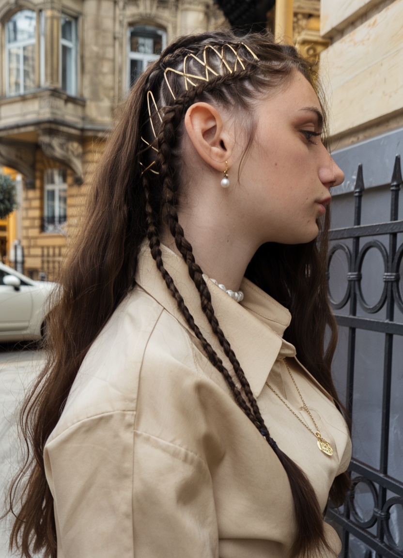 This stylish braided look with golden accessories is a standout choice for fall hairstyles for long hair 2024. Perfect for a casual day out or an autumn evening event, the tight braids and crisscrossed gold elements add a trendy and unique flair. This hairstyle is ideal for brunettes looking for an edgy yet easy style that can transition from work to a wedding guest look. The mix of texture and sleekness creates a trendy and sophisticated aesthetic that pairs well with neutral tones and fall fashion trends.