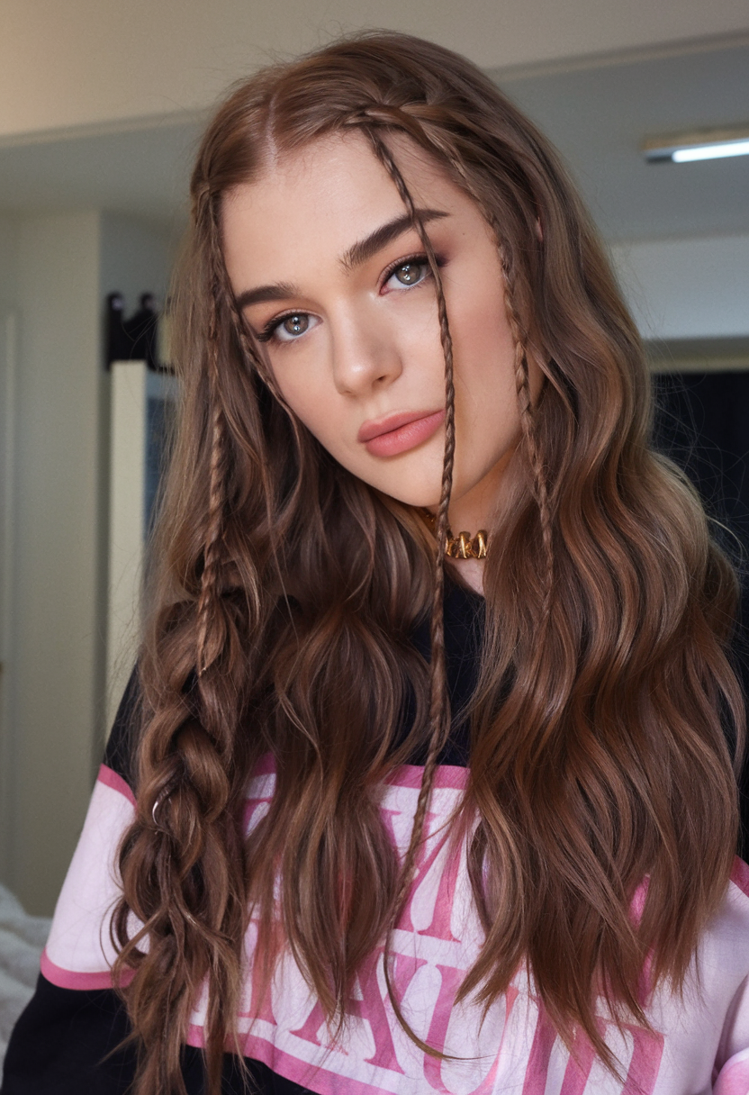 This soft, bohemian-inspired braided hairstyle is an effortless yet stunning option for fall hairstyles for long hair 2024. With loose waves and delicate braids framing the face, this look works well for both casual days and more formal events like prom or weddings. The easy, tousled waves give off a romantic vibe, making it an excellent choice for a bridesmaid or wedding guest style. The braids add a whimsical, carefree touch to an otherwise simple, trendy fall look.
