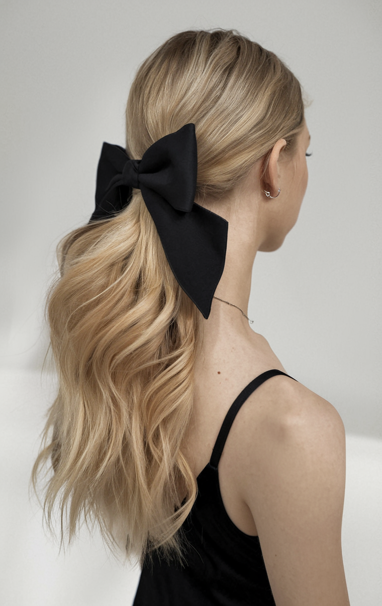 This blonde wavy hairstyle is paired with a large black bow accessory, offering a chic and polished finish. The waves add movement, while the bow gives the look a playful, feminine touch. Perfect for women with medium length hair, this autumn hairstyle blends elegance with simplicity, making it a popular pick for fall 2024 trends.