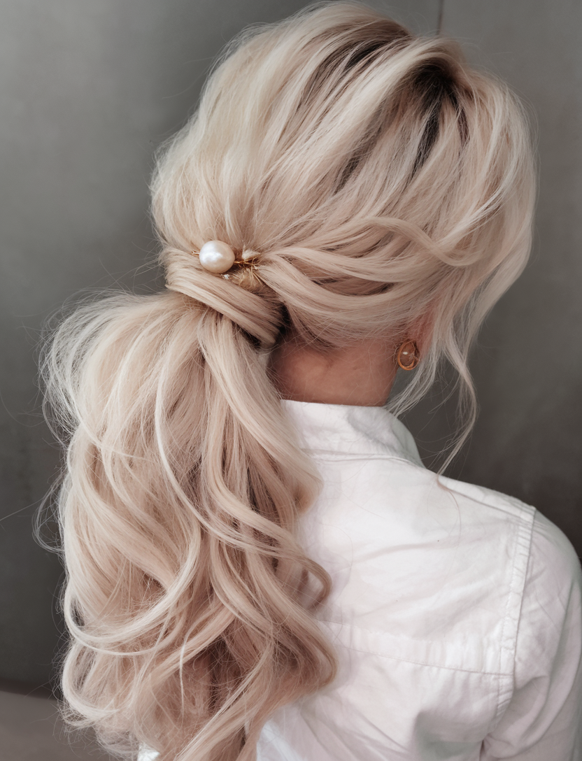 Voluminous Blonde Ponytail with Pearl Accent
