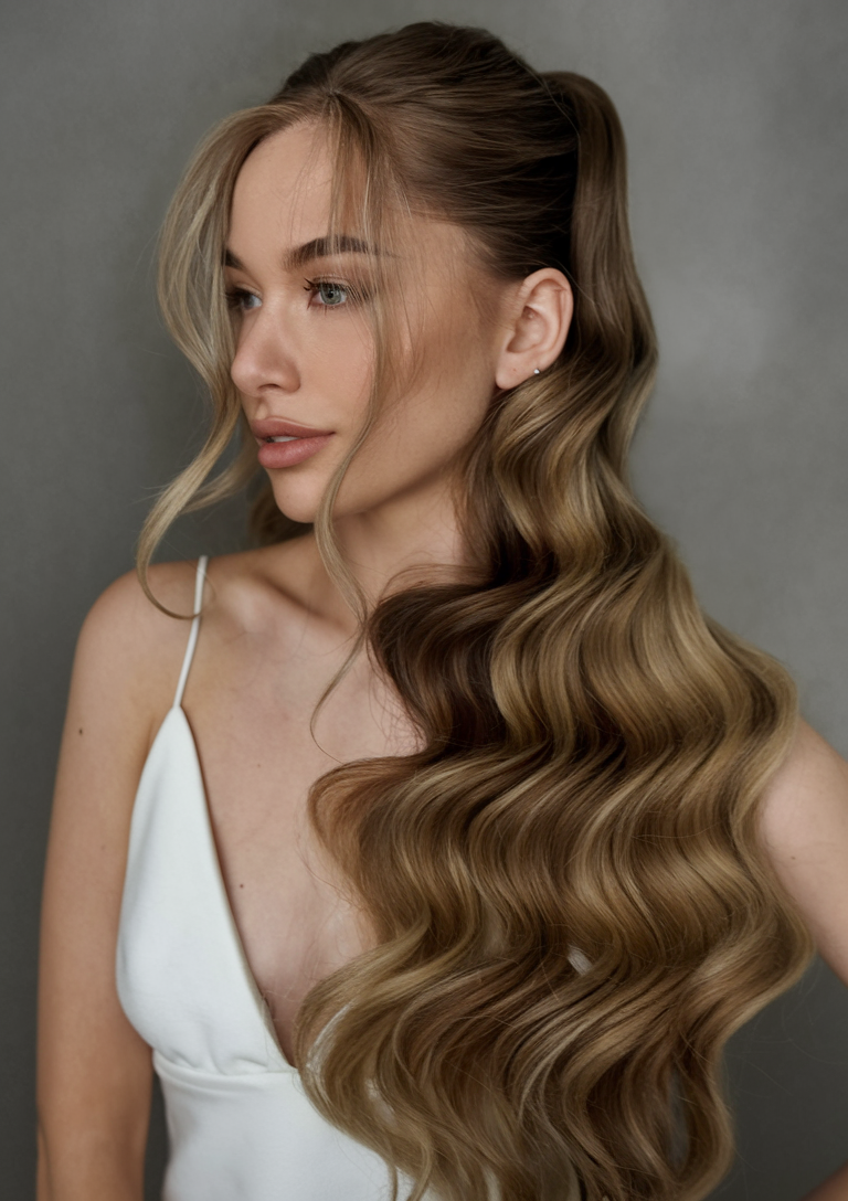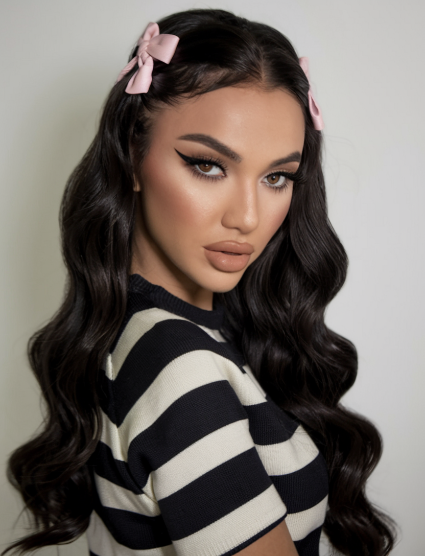 This long wavy hairstyle for brunettes features sleek, defined waves accented with soft pink bow accessories for a playful yet sophisticated touch. The combination of classic waves and girlish details makes this a trendy choice among autumn hair ideas. Perfect for women black hair, this style can easily be dressed up or down, making it versatile for everyday wear or special occasions.